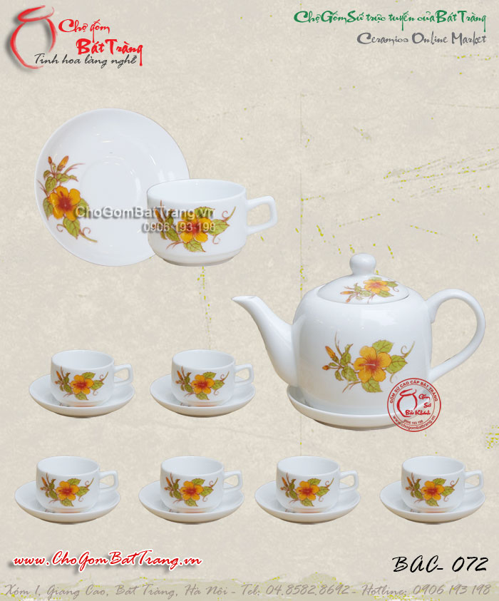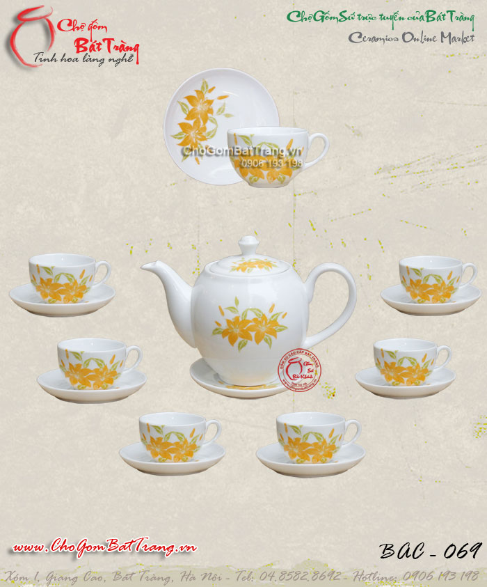 Bộ ấm chén men trắng đầm hoa thị