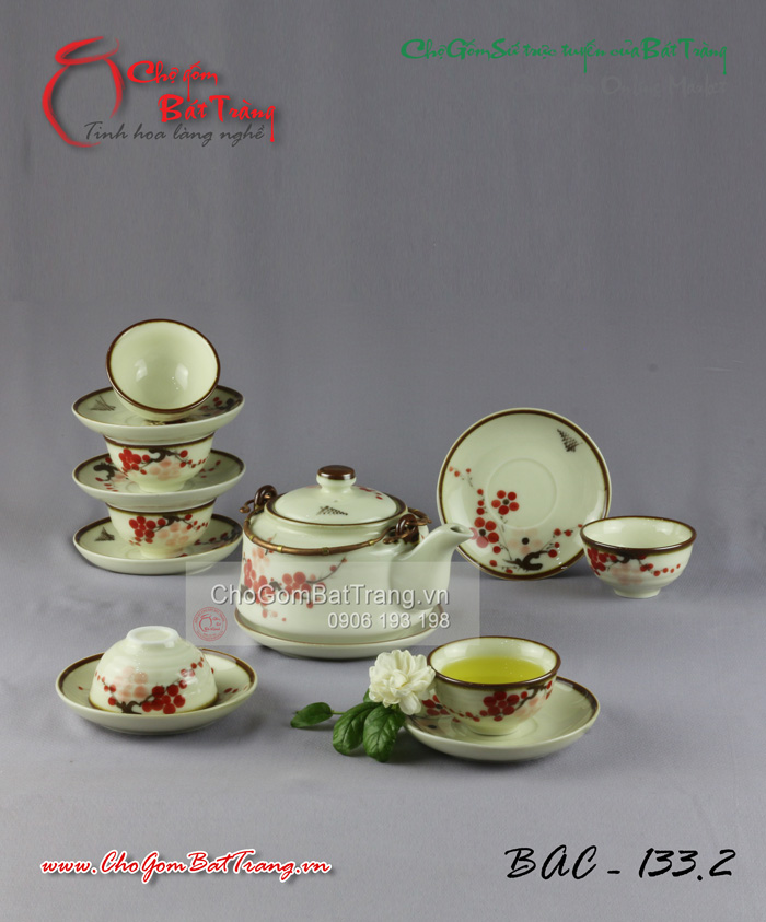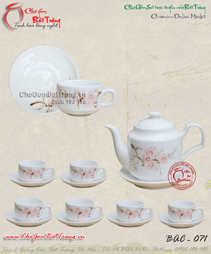 Bộ ấm chén men trắng CK cao vẽ hoa đào
