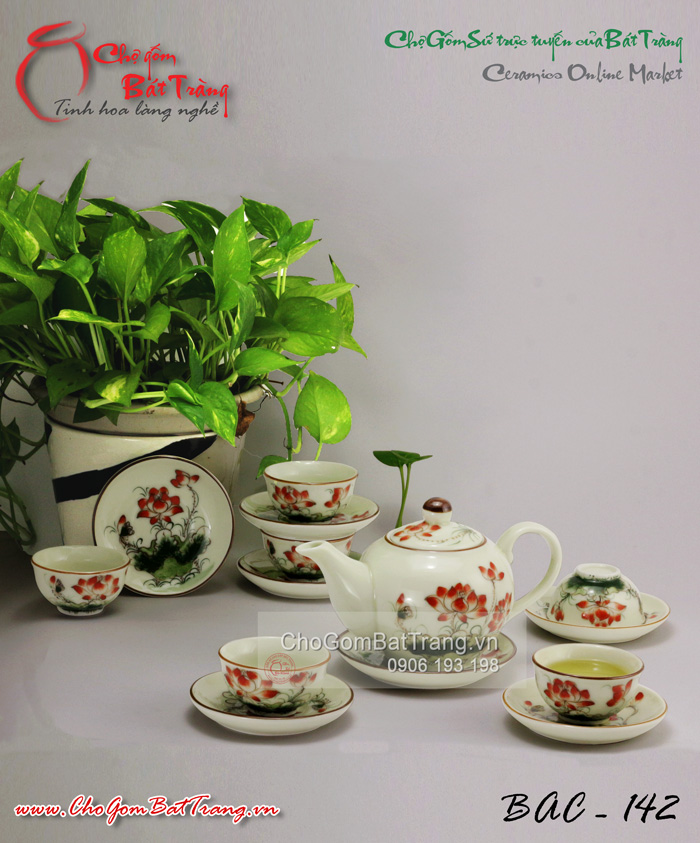 Ấm chén Vuông men kem in hoa sen