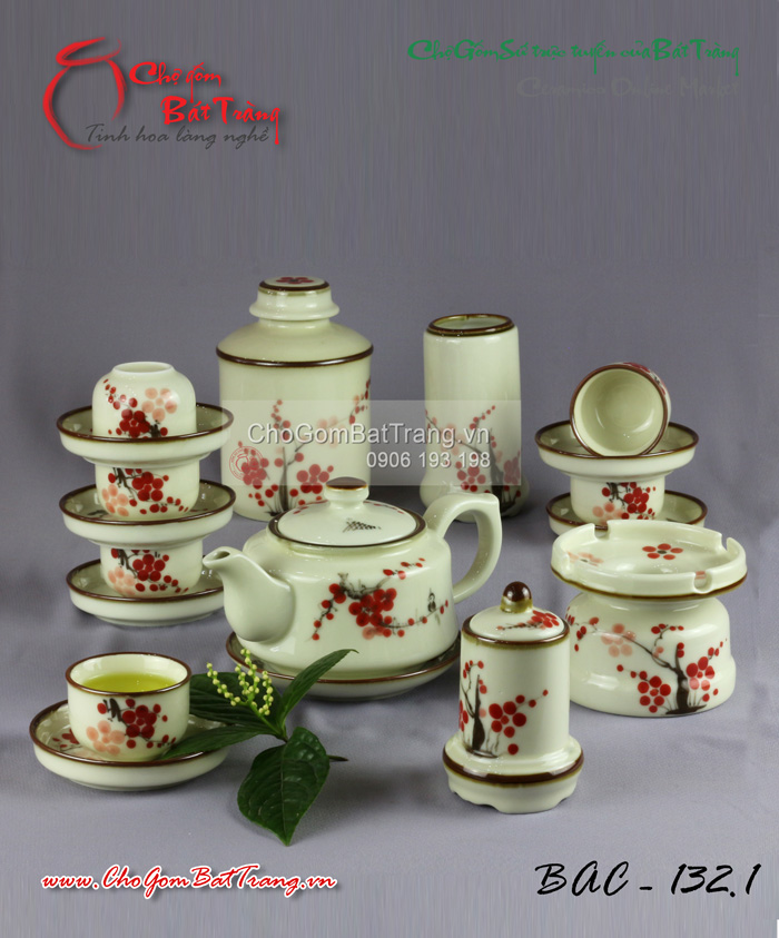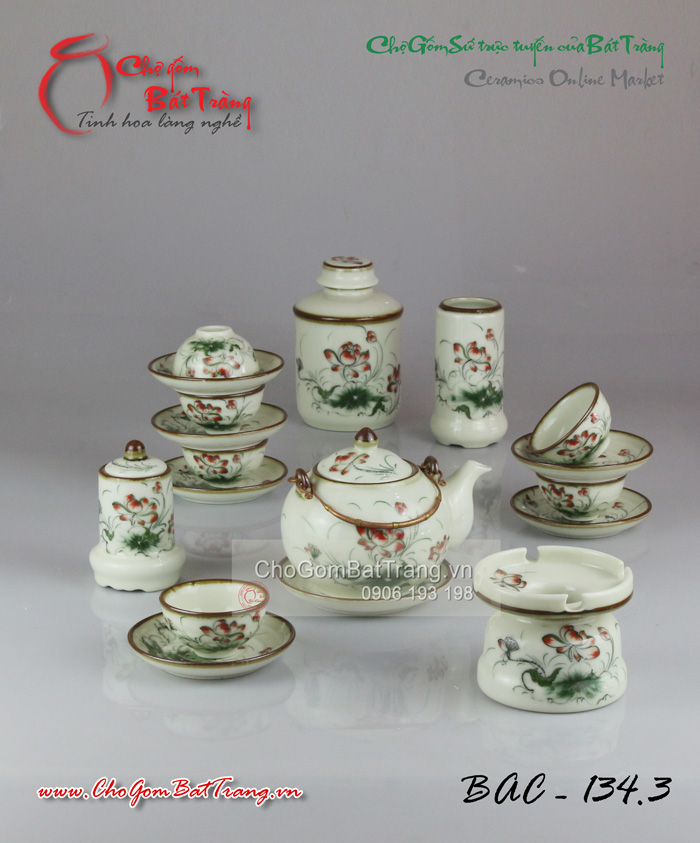 Bộ ấm chén Bát Tràng vẽ hoa râm bụt